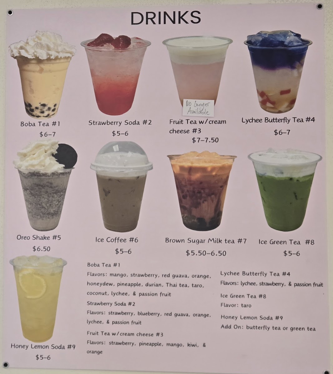Flavors: mango, strawberry, red guava, orange, honey dew, pineapple, durian, Thai tea, taro, coconut, lychee, & passion fruit.